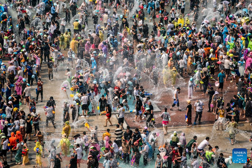 People splash water on one another to celebrate the water-splashing festival at a square in Jinghong City, Dai Autonomous Prefecture of Xishuangbanna, southwest China's Yunnan Province, April 15, 2023. (Xinhua/Hu Chao)