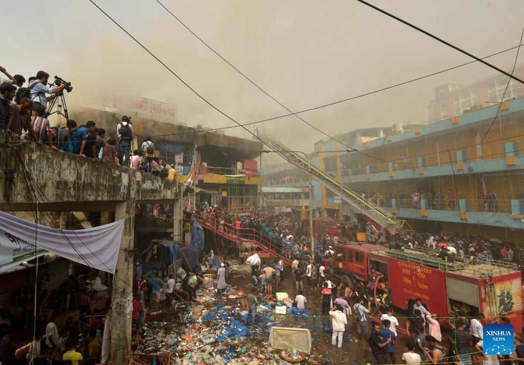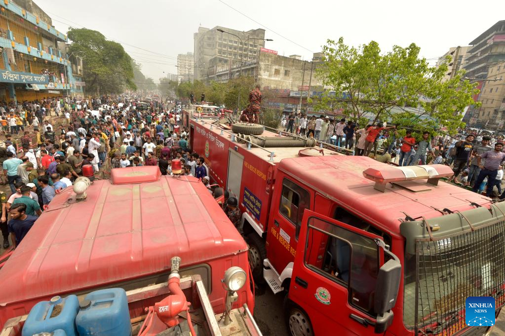 DHAKA, April 15 (Xinhua) -- A massive fire broke out at a popular clothing market in Bangladesh's capital Dhaka on Saturday morning.