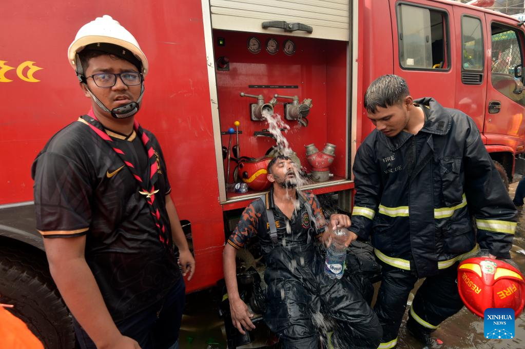 A firefighter takes a break at the site where a massive fire broke out at a popular clothing market in Dhaka, Bangladesh, April 15, 2023. The fire broke out here on Saturday morning. Ershad Hossain, senior duty officer of the Fire Service and Civil Defence Headquarters, told Xinhua that 30 fire engines were fighting the fire in the city's major "New Super Market." (Xinhua)