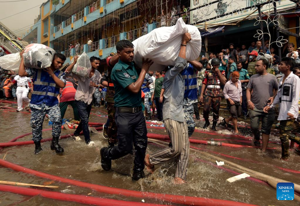 People carry goods from the site where a massive fire broke out at a popular clothing market in Dhaka, Bangladesh, April 15, 2023. The fire broke out here on Saturday morning. Ershad Hossain, senior duty officer of the Fire Service and Civil Defence Headquarters, told Xinhua that 30 fire engines were fighting the fire in the city's major "New Super Market." (Xinhua)