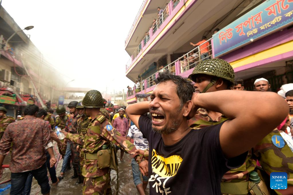 A man cries near the site where a massive fire broke out at a popular clothing market in Dhaka, Bangladesh, April 15, 2023. The fire broke out here on Saturday morning. Ershad Hossain, senior duty officer of the Fire Service and Civil Defence Headquarters, told Xinhua that 30 fire engines were fighting the fire in the city's major "New Super Market." (Xinhua)