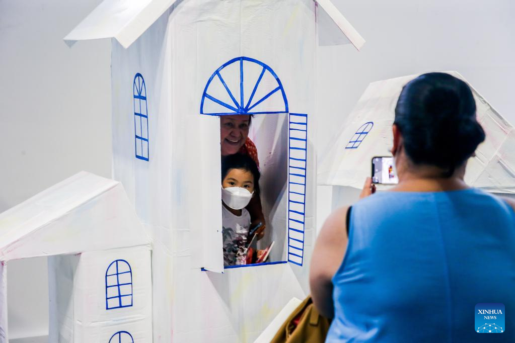People take a photo with an art installation at an art exhibition at the University of the Philippines College of Fine Arts on the occasion of the World Art Day in Quezon City, the Philippines, April 15, 2023. The World Art Day falls on April 15 every year. (Xinhua/Rouelle Umali)