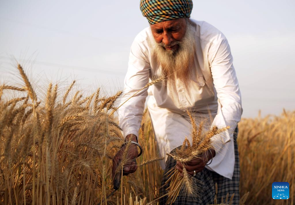 A farmer harvests wheat crops with traditional method in a wheat farm in Amritsar district of India's northern Punjab state, April 16, 2023. (Str/Xinhua)