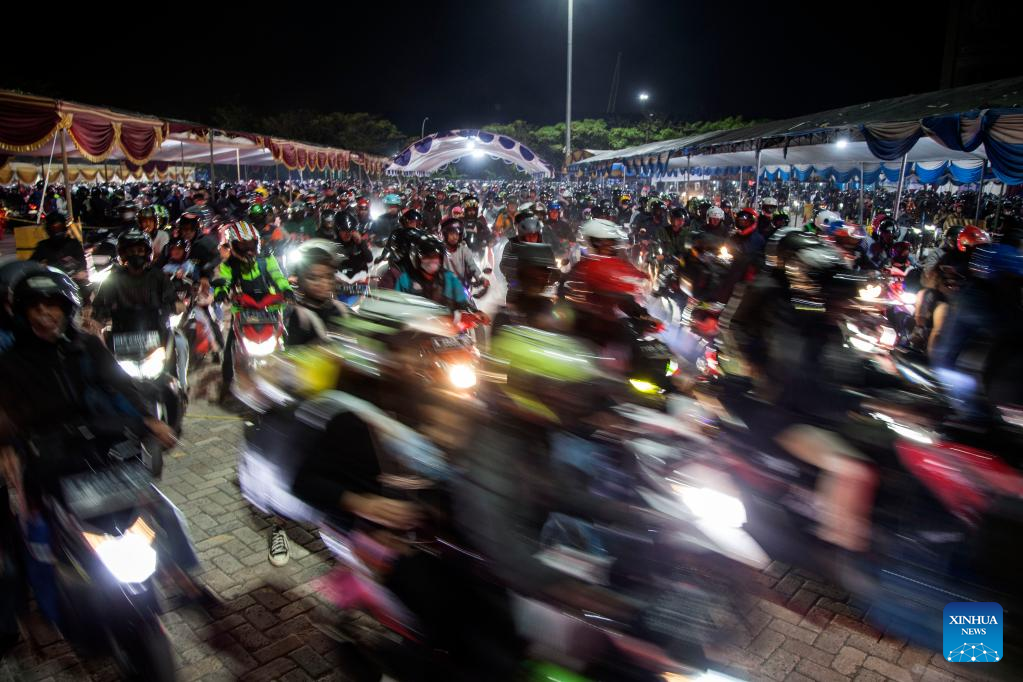 People riding motorbikes prepare to board a ferry ahead of Eid al-Fitr at Ciwandan Port in Cilegon, Banten Province, Indonesia, on April 19, 2023. (Photo by Aditya Irawan/Xinhua)