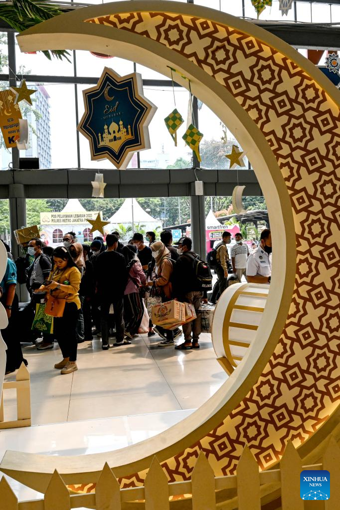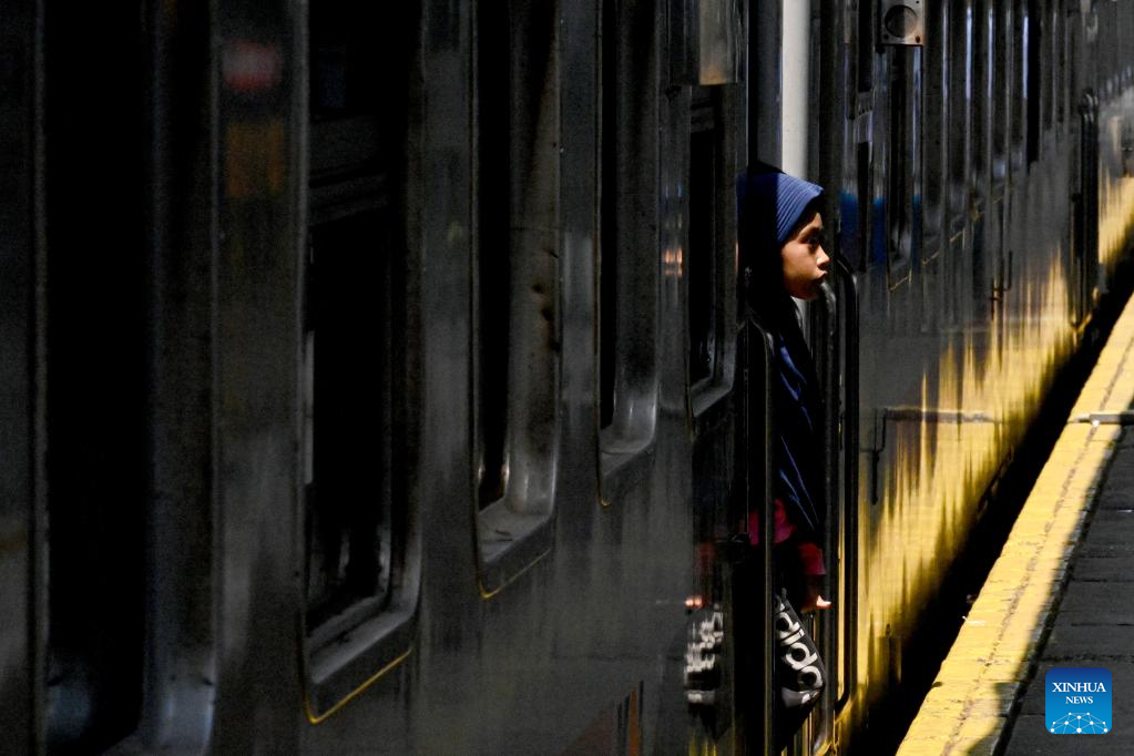 Passengers are seen before boarding a train ahead of Eid al-Fitr at Pasar Senen train station in Jakarta, Indonesia, on April 19, 2023. (Xinhua/Agung Kuncahya B.)