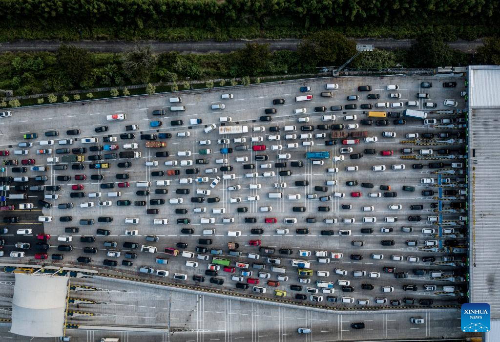 This aerial photo taken on April 19, 2023 shows vehicles in a traffic jam ahead of Eid al-Fitr at Cikampek Utama toll gate in Karawang, West Java, Indonesia. (Photo by Adishree JR/Xinhua)