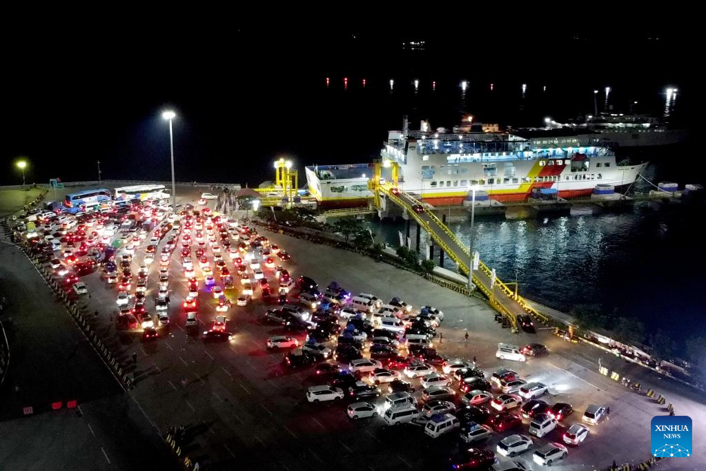 This aerial photo taken on April 19, 2023 shows vehicles preparing to board a ferry ahead of the Eid al-Fitr at Ciwandan Port in Cilegon, Banten Province, Indonesia. (Photo by Aditya Irawan/Xinhua)