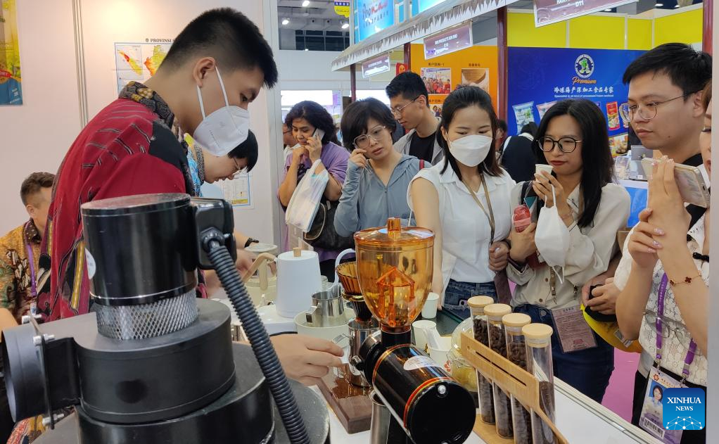 Visitors taste Indonesian coffee exhibited by the Indonesia China Business Council (North Sumatra) at the 133rd session of the China Import and Export Fair, also known as the Canton Fair, in Guangzhou, south China's Guangdong Province, May 2, 2023.(Xinhua/Lu Hao)