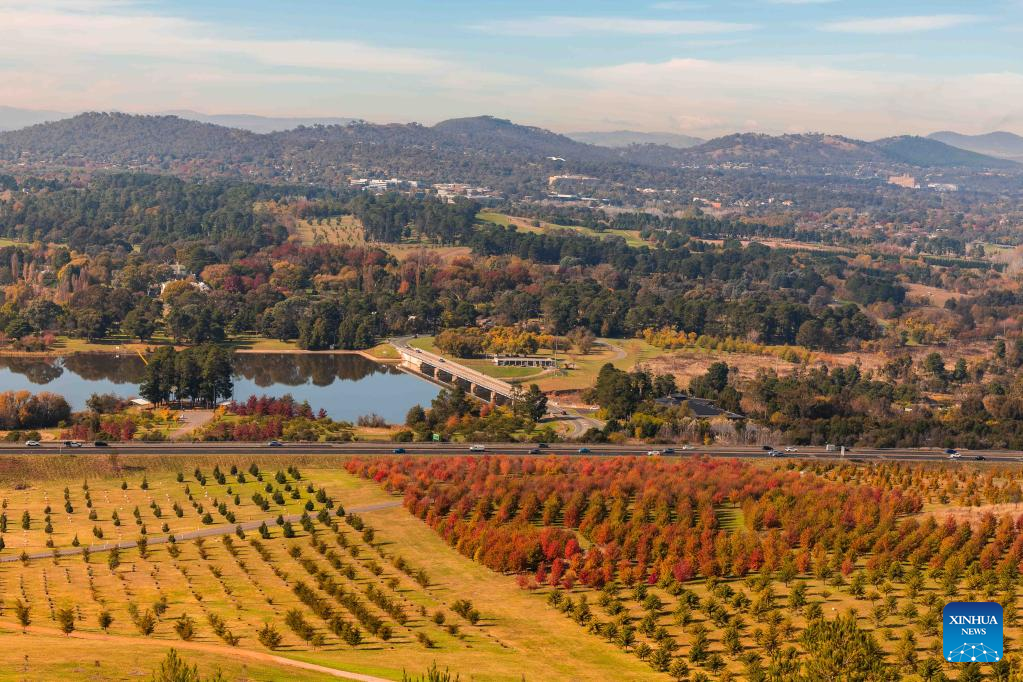 This photo taken on May 5, 2023 shows autumn scenery of Lake Burley Griffin in Canberra, Australia. (Photo by Chu Chen/Xinhua)