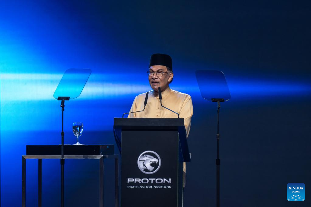 Malaysian Prime Minister Anwar Ibrahim speaks at the official launch of Proton's newest model, the Proton X90 sports utility vehicle (SUV), in Kuala Lumpur, Malaysia, May 7, 2023. The continued partnership and close collaboration between Malaysian national carmaker Proton and China's Geely are of strategic importance, Malaysian Prime Minister Anwar Ibrahim said on Sunday. (Xinhua/Zhu Wei)
