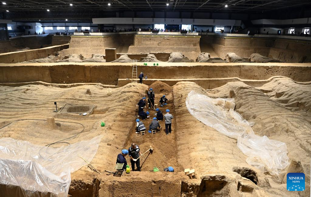 Staff members work at the pit No.2 of the Emperor Qinshihuang's Mausoleum Site Museum in Xi'an, northwest China's Shaanxi Province, April 26, 2023. Xi'an, a city with over 3,100 years of history, served as the capital for 13 dynasties in Chinese history. It is also home to the world-renowned Terracotta warriors.