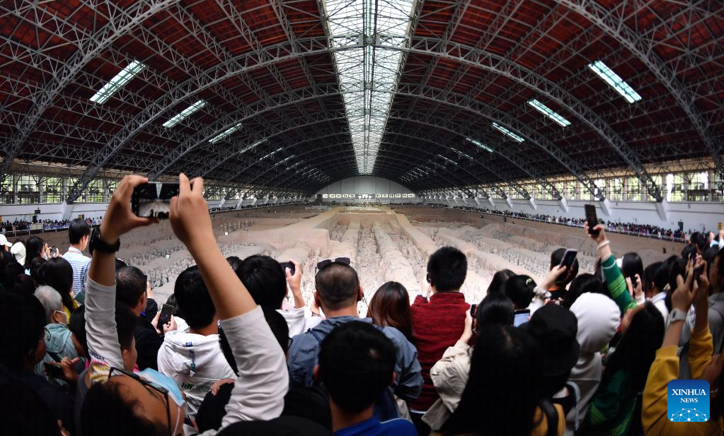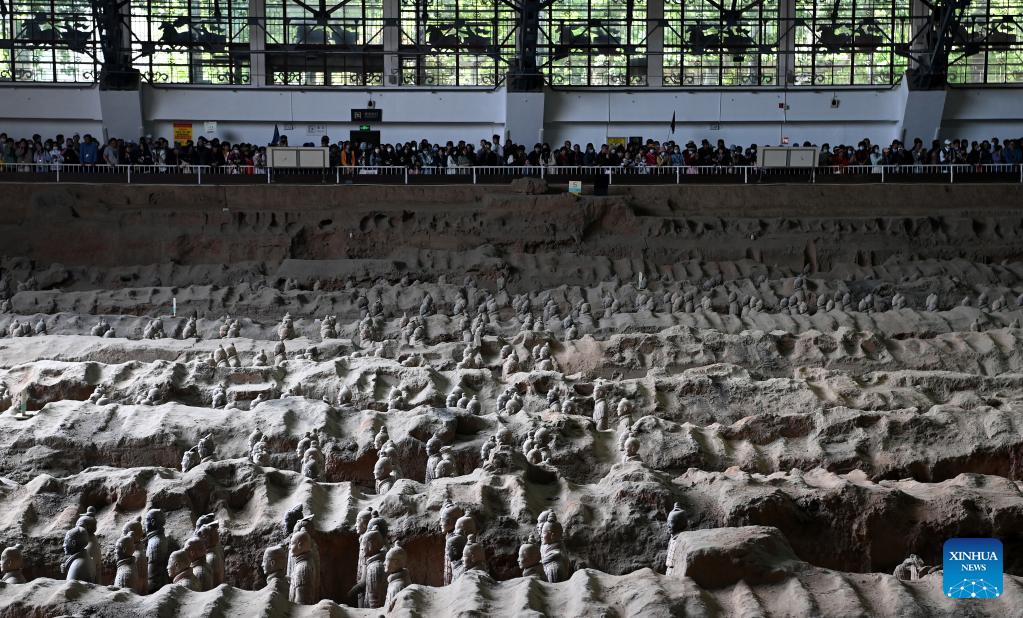 People visit pit No.1 of the Emperor Qinshihuang's Mausoleum Site Museum in Xi'an, northwest China's Shaanxi Province, April 26, 2023. Xi'an, a city with over 3,100 years of history, served as the capital for 13 dynasties in Chinese history. It is also home to the world-renowned Terracotta warriors.