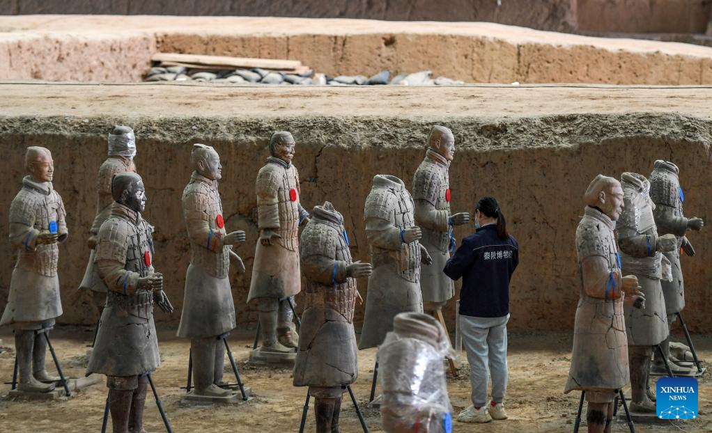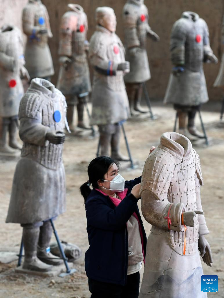 A staff member repairs a terracotta warrior at the pit No.1 of the Emperor Qinshihuang's Mausoleum Site Museum in Xi'an, northwest China's Shaanxi Province, April 26, 2023. Xi'an, a city with over 3,100 years of history, served as the capital for 13 dynasties in Chinese history. It is also home to the world-renowned Terracotta warriors.