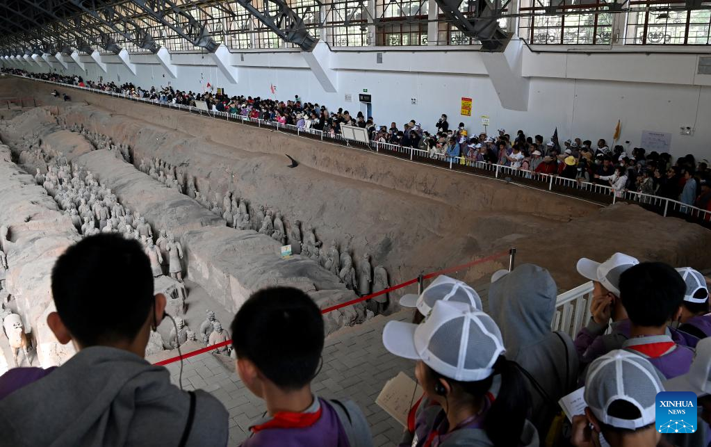 People visit the Emperor Qinshihuang's Mausoleum Site Museum in Xi'an, northwest China's Shaanxi Province, April 26, 2023. Xi'an, a city with over 3,100 years of history, served as the capital for 13 dynasties in Chinese history. It is also home to the world-renowned Terracotta warriors.