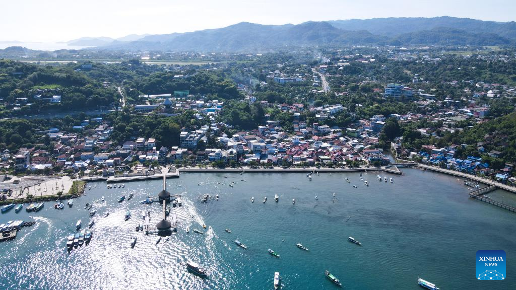 This aerial photo taken on May 12, 2023 shows seaside scenery in Labuan Bajo, a tourist town in East Nusa Tenggara Province, Indonesia. (Xinhua/Xu Qin)