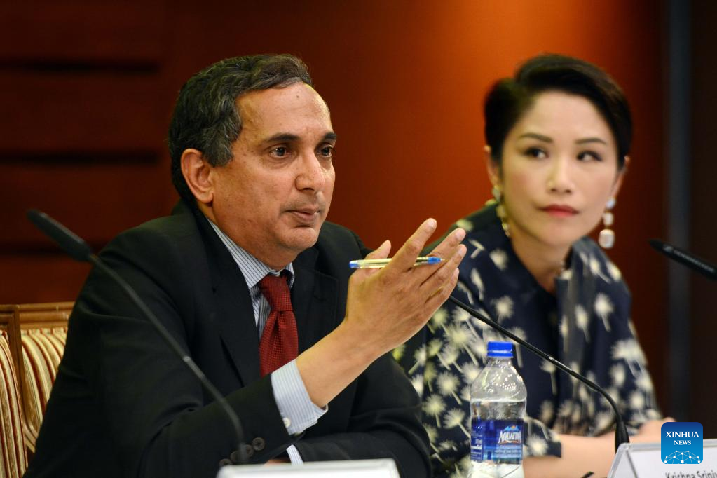 Director of Asia and Pacific Department of the International Monetary Fund (IMF) Krishna Srinivasan (L) attends a press conference in Colombo, Sri Lanka, on May 15, 2023. The IMF on Monday commended Sri Lanka's progress on the economic reforms. (Photo by Gayan Sameera/Xinhua)