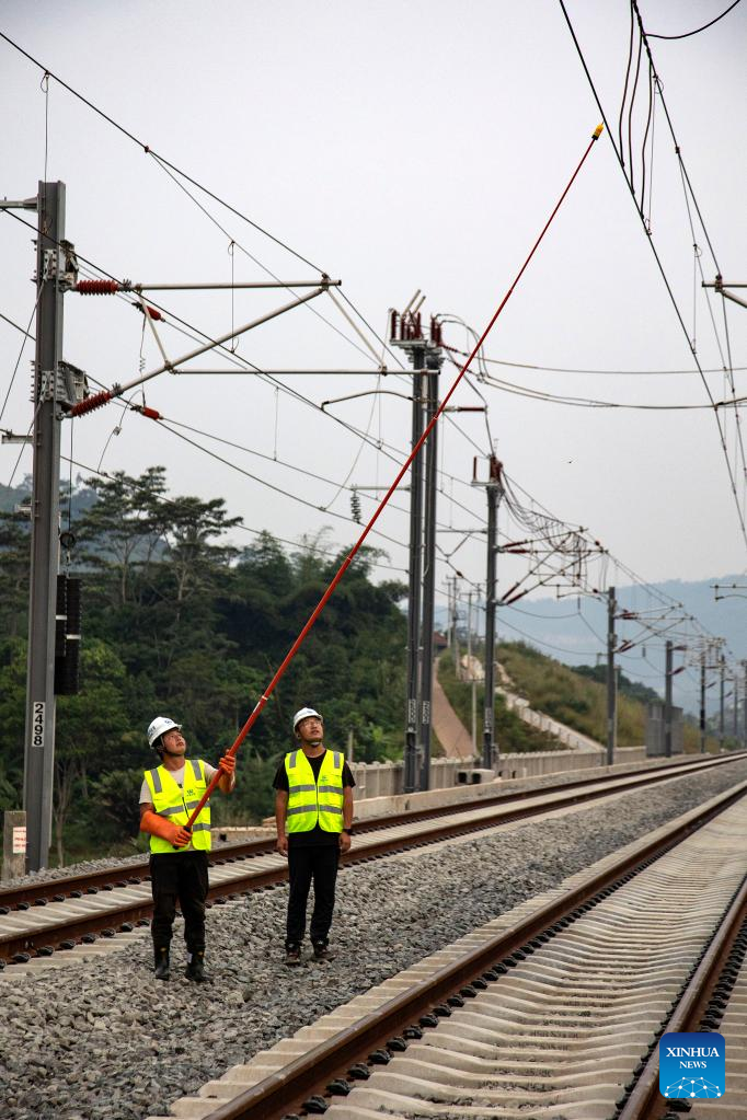 Technicians from China Railway Electrification Engineering Group Co., Ltd conduct electrical inspections along the Jakarta-Bandung High-Speed Railway in Indonesia, May 18, 2023. Power transmission by overhead catenary system (OCS) along the whole line of Jakarta-Bandung High-Speed Railway (HSR) was conducted successfully on Thursday. (Photo by Jiao Hongtao/Xinhua)