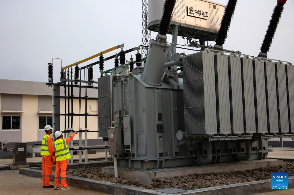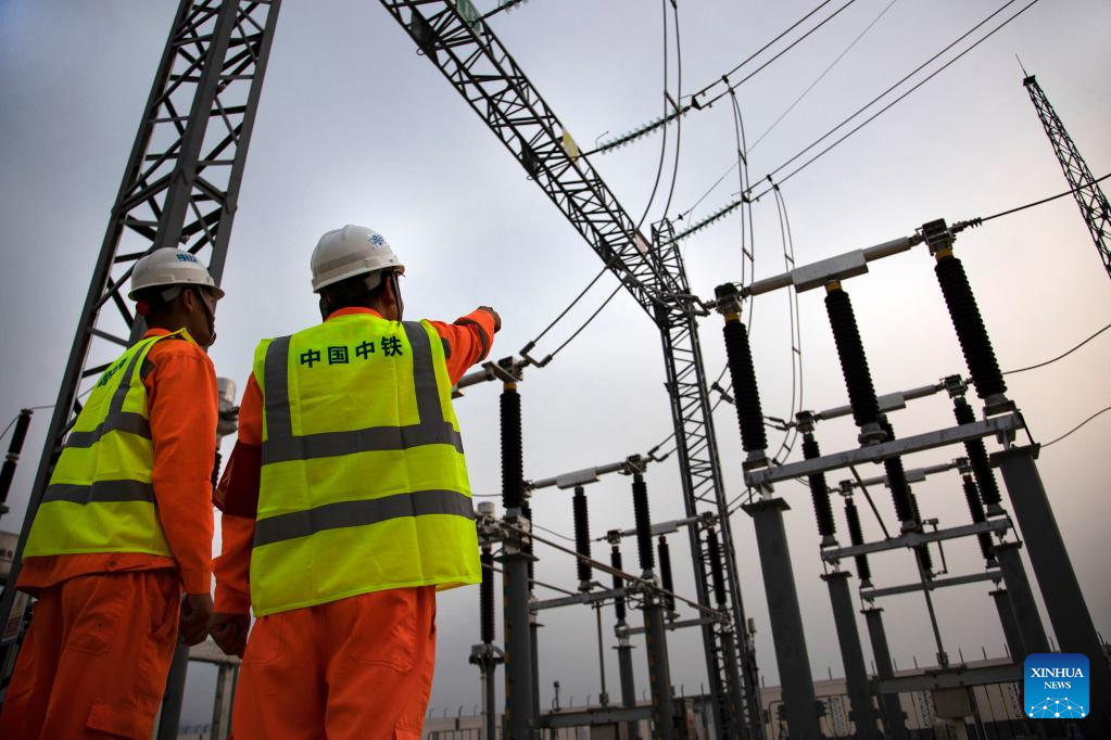 Technicians from China Railway Electrification Engineering Group Co., Ltd inspect the equipment before power transmission at a substation of the Jakarta-Bandung High-Speed Railway in Indonesia, May 18, 2023. Power transmission by overhead catenary system (OCS) along the whole line of Jakarta-Bandung High-Speed Railway (HSR) was conducted successfully on Thursday. (Photo by Jiao Hongtao/Xinhua)