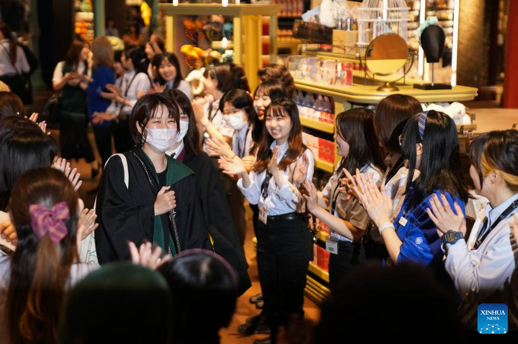 Staff members welcome the first visitors to the theme park "Warner Bros. Studio Tour Tokyo - The Making of Harry Potter" in Tokyo, Japan, June 16, 2023. The Harry Potter theme park officially opened Friday in Tokyo. (Xinhua/Zhang Xiaoyu)