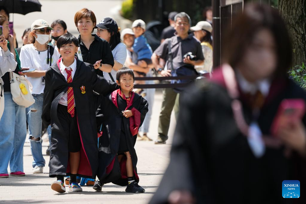 Kids in costumes enter the theme park "Warner Bros. Studio Tour Tokyo - The Making of Harry Potter" in Tokyo, Japan, June 16, 2023. The Harry Potter theme park officially opened Friday in Tokyo. (Xinhua/Zhang Xiaoyu)