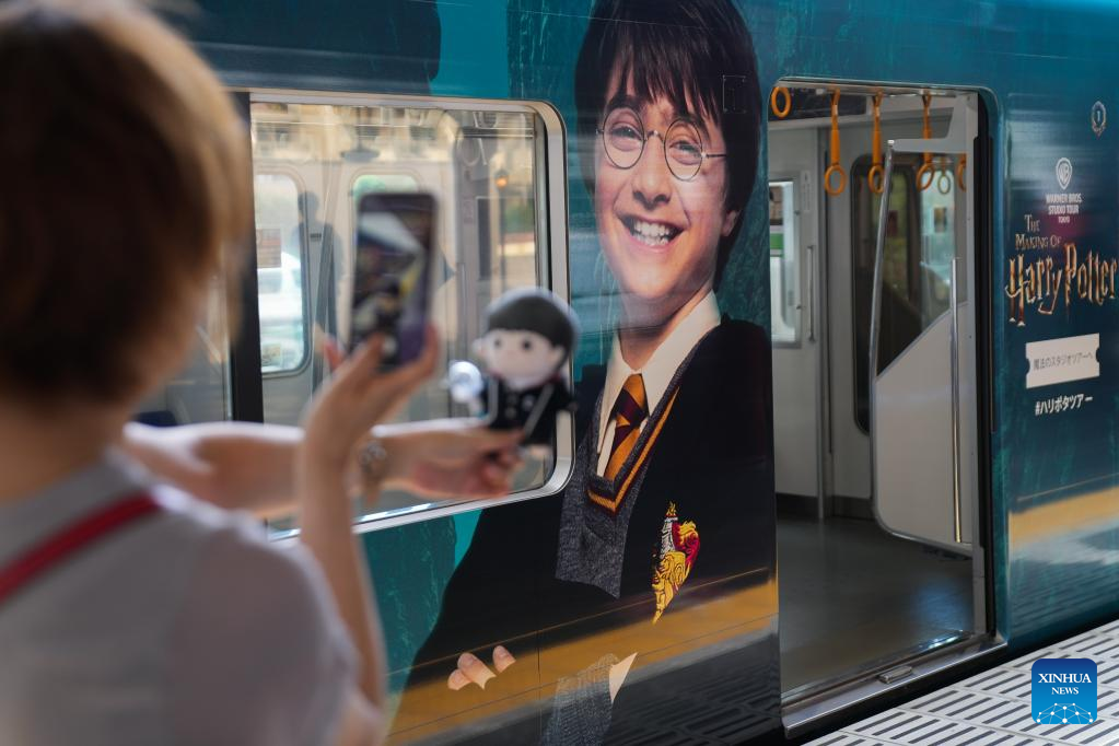 A visitor takes photos of a Harry Potter-themed figurine with a metro train promoting the theme park "Warner Bros. Studio Tour Tokyo - The Making of Harry Potter" at Toshimaen Station in Tokyo, Japan, June 16, 2023. The Harry Potter theme park officially opened Friday in Tokyo. (Xinhua/Zhang Xiaoyu)