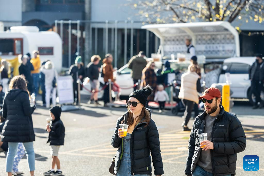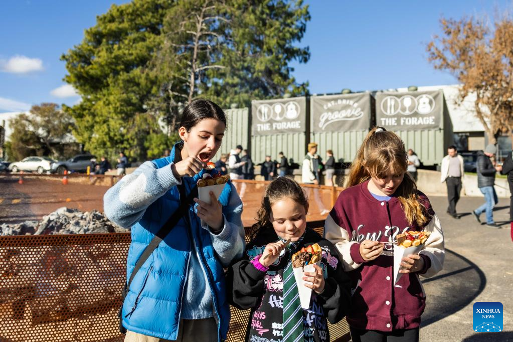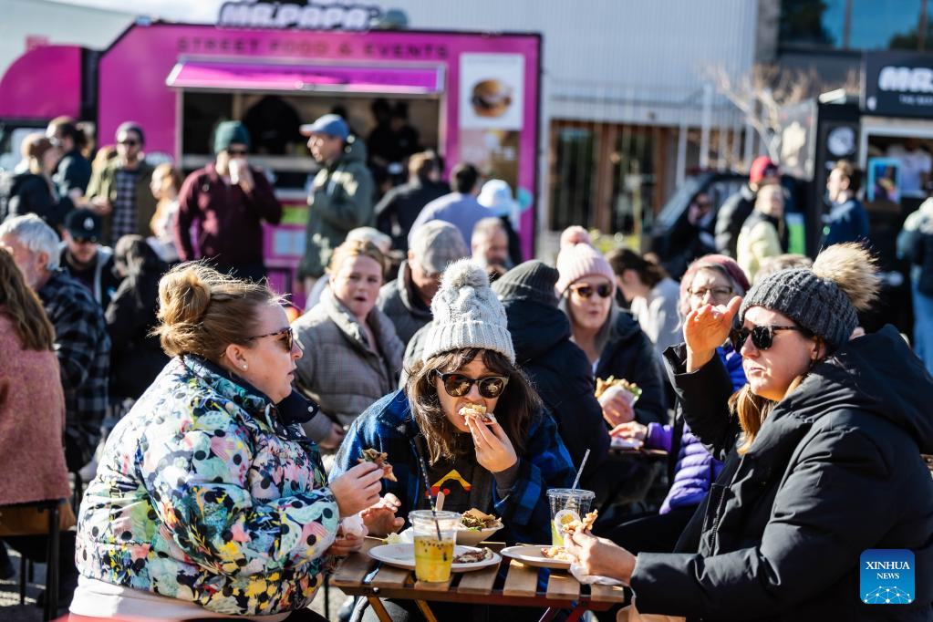 People attend a winter food festival in Canberra, Australia, on June 24, 2023. A winter food festival was held on Saturday to provide street food and other products by local cafes, food trucks, wineries and breweries for customers. (Photo by Chu Chen/Xinhua)
