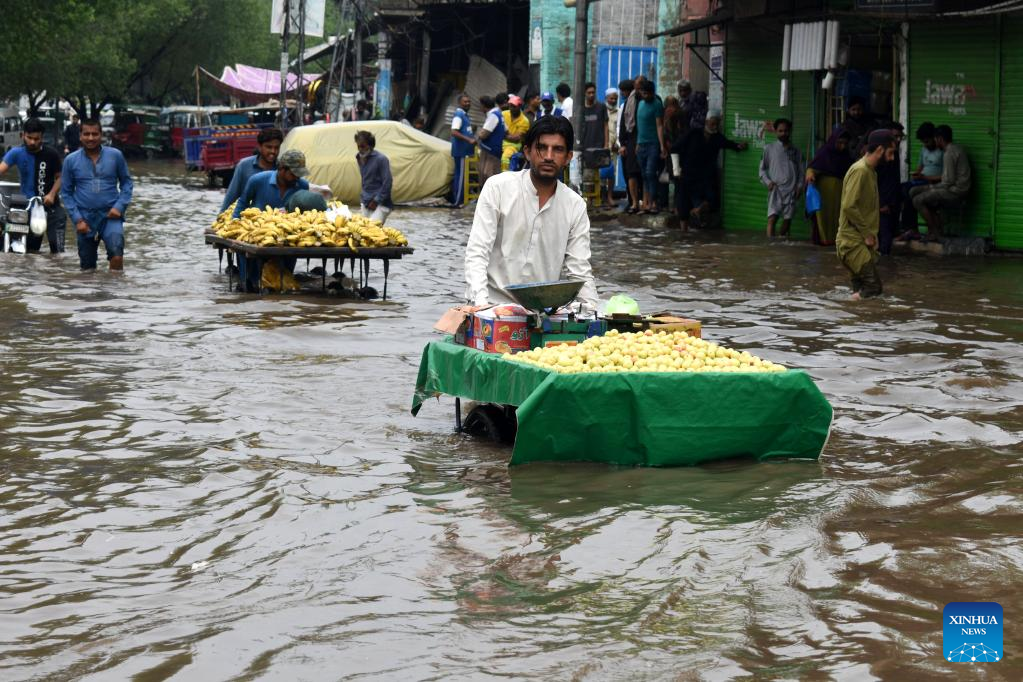 Fruit vendors carrying their carts wade through a flooded road after heavy rain in Lahore, Pakistan, June 26, 2023. At least 14 people were killed and six others injured in rain-related accidents in different areas of Pakistan during the last 24 hours, officials said on Monday. (Photo by Sajjad/Xinhua)