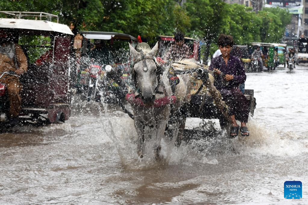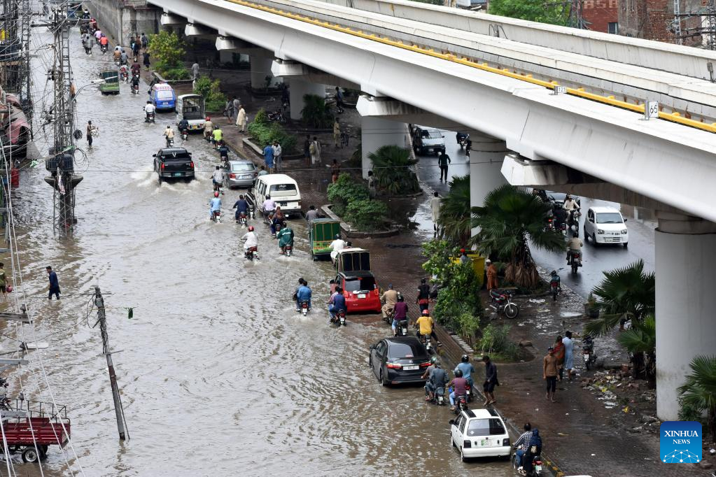 Vehicles move on a flooded road after heavy rain in Lahore, Pakistan, June 26, 2023. At least 14 people were killed and six others injured in rain-related accidents in different areas of Pakistan during the last 24 hours, officials said on Monday. (Photo by Sajjad/Xinhua)