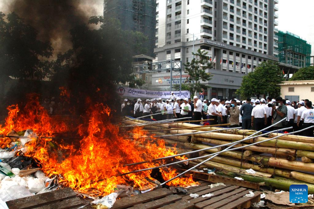 Cambodian officials set fire on a batch of seized illicit drugs and ingredients in Phnom Penh, Cambodia, June 28, 2023. Cambodia on Wednesday destroyed 5.71 tons of illicit drugs and ingredients, officials said. (Photo by Phearum/Xinhua)