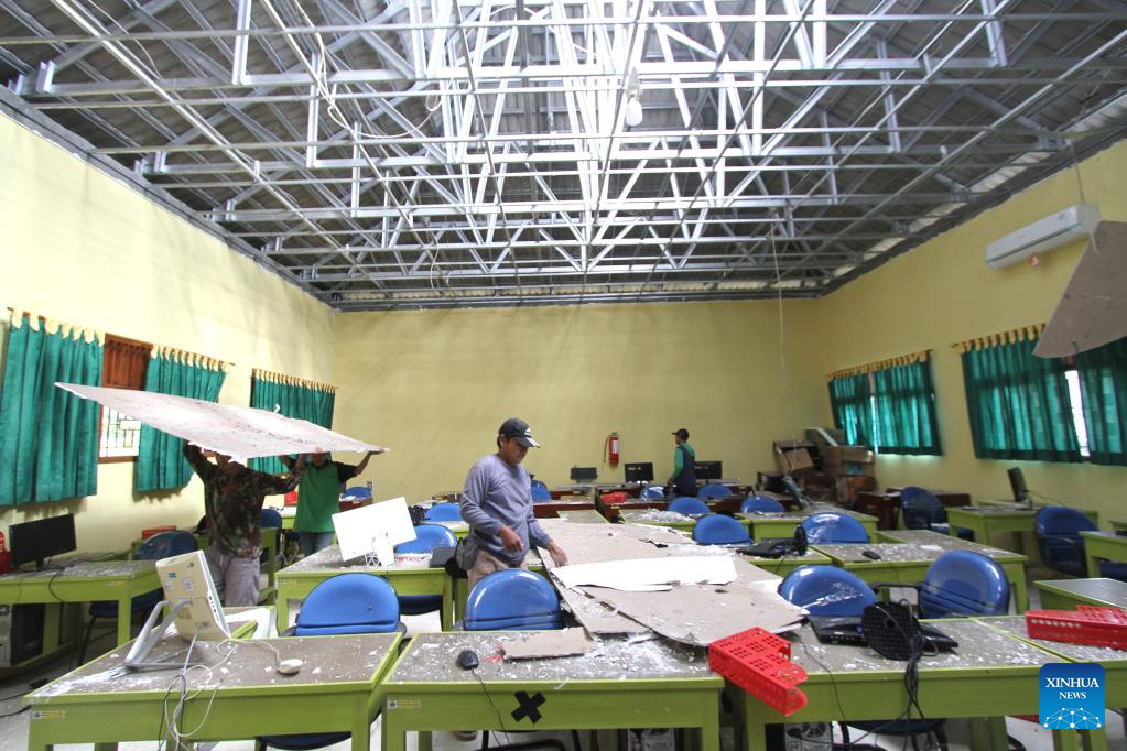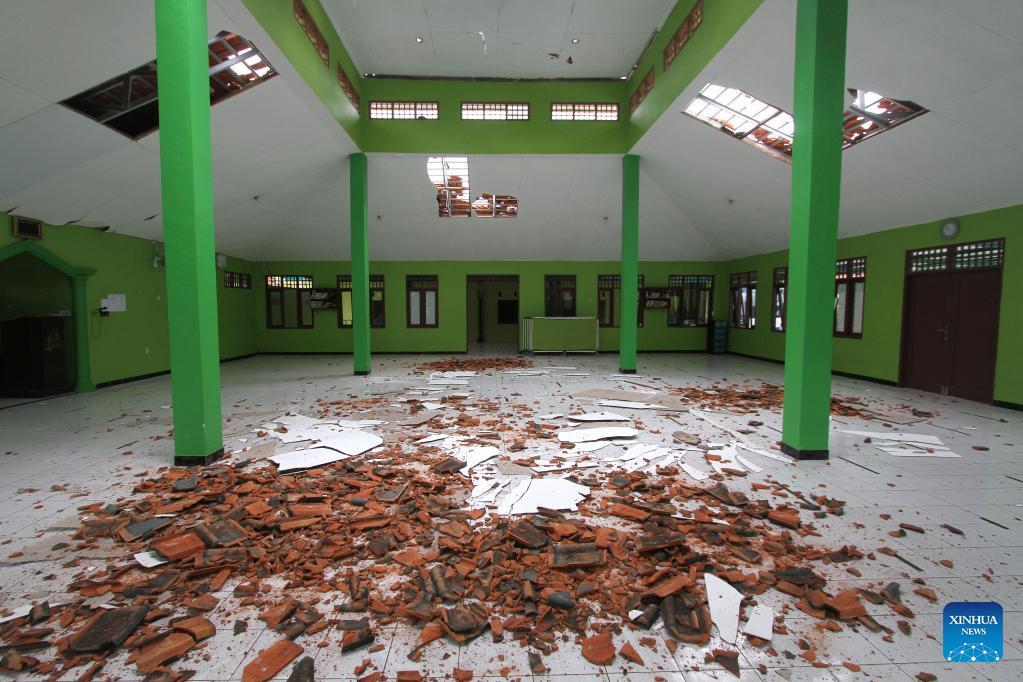 People try to remove the debris of a room ceiling inside a school building damaged in a 6.0-magnitude earthquake at a village of Tirtomoyo district, Wonogiri regency, Central Java, Indonesia, July 1, 2023. One person was killed and at least 9 others were injured after a 6.0-magnitude earthquake has destroyed over 100 houses and infrastructure facilities in Yogyakarta province and its nearby provinces, officials said Saturday. (Photo by Bram Selo/Xinhua)