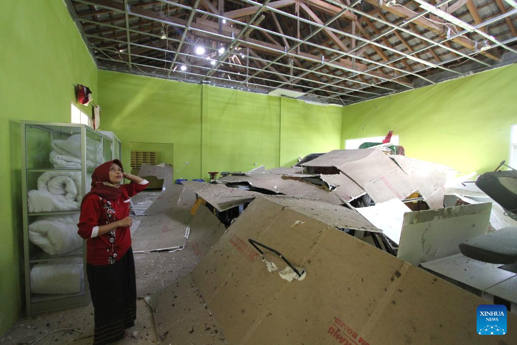 A woman stands near the debris of a room ceiling inside a school building damaged in a 6.0-magnitude earthquake at a village of Tirtomoyo district, Wonogiri regency, Central Java, Indonesia, July 1, 2023. One person was killed and at least 9 others were injured after a 6.0-magnitude earthquake has destroyed over 100 houses and infrastructure facilities in Yogyakarta province and its nearby provinces, officials said Saturday. (Photo by Bram Selo/Xinhua)