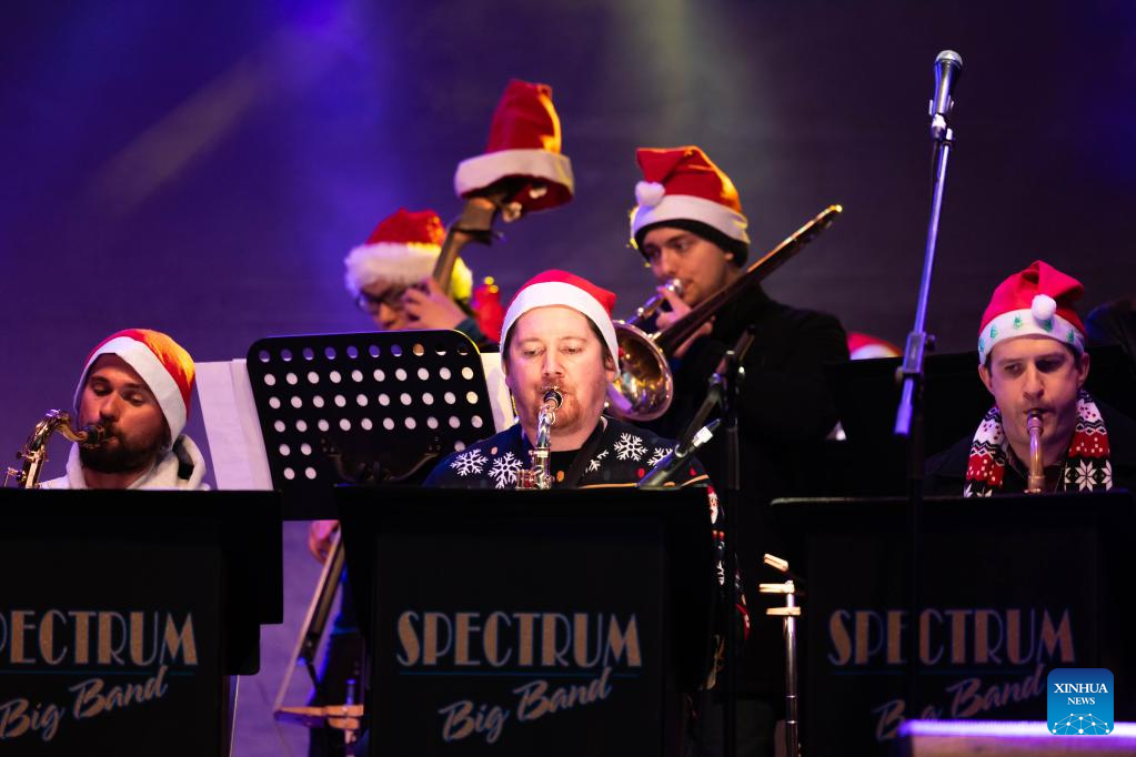 This photo taken on July 2, 2023 shows live concert during the "Christmas in July Festival" in Canberra, Australia. An European style Christmas market was held in Canberra from June 29 to July 2 to let the local people experience a cold Christmas in the current winter month. (Photo by Chu Chen/Xinhua)