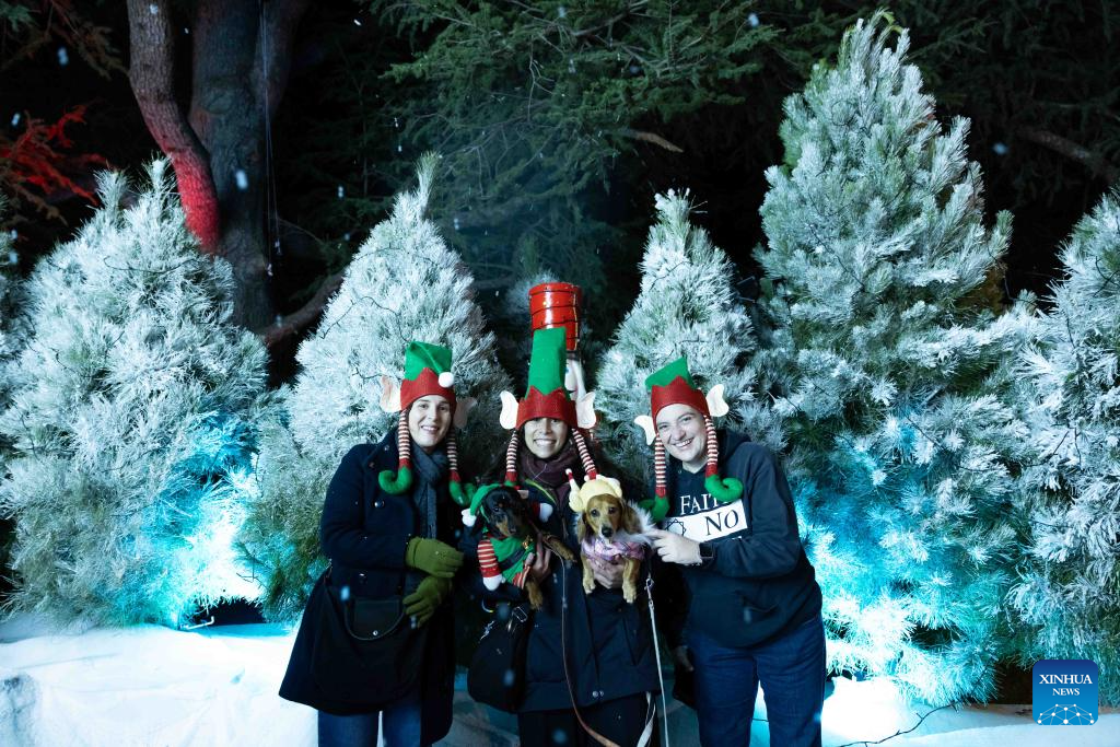 People pose for photos in front of decorations during the "Christmas in July Festival" in Canberra, Australia, July 2, 2023. An European style Christmas market was held in Canberra from June 29 to July 2 to let the local people experience a cold Christmas in the current winter month. (Photo by Chu Chen/Xinhua)