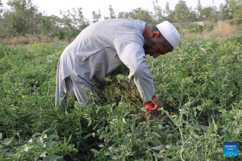 A farmer harvests tomatoes in Jawzjan Province, Afghanistan, July 3, 2023. (Photo by Zekrullah Yazdani/Xinhua)