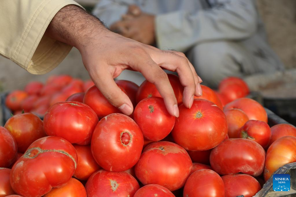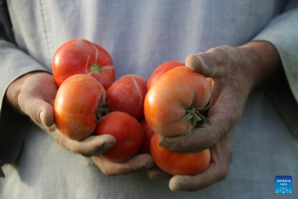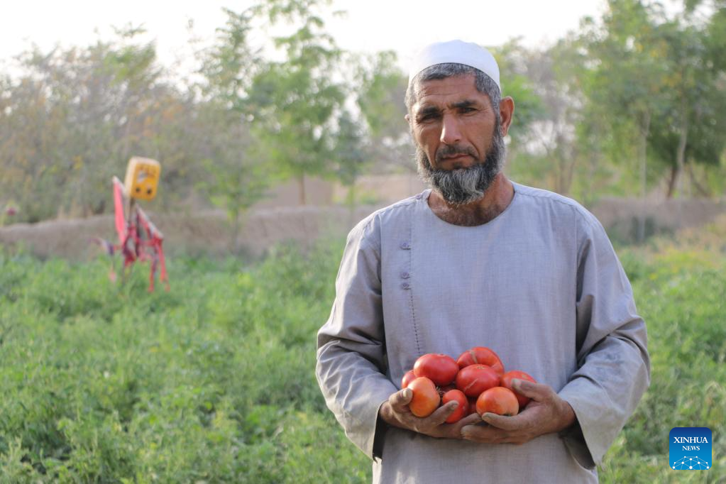 A farmer holding newly-harvested tomatoes is pictured in Jawzjan Province, Afghanistan, July 3, 2023. (Photo by Zekrullah Yazdani/Xinhua)