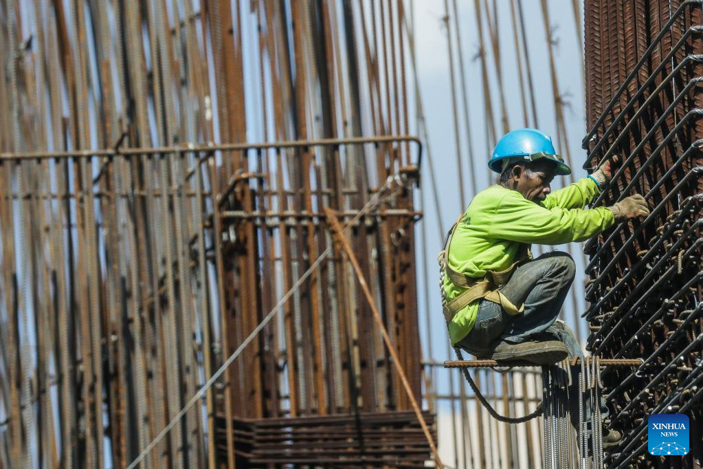 A worker is seen at a construction site in Quezon City, the Philippines, on July 8, 2023. The Philippines' unemployment rate in May dropped to 4.3 percent from 4.5 percent in April, with 2.17 million labor force out of job, the Philippine Statistics Authority (PSA) said on Friday. (Xinhua/Rouelle Umali)