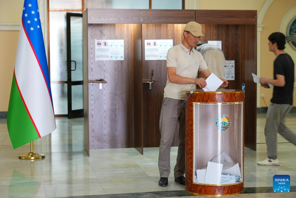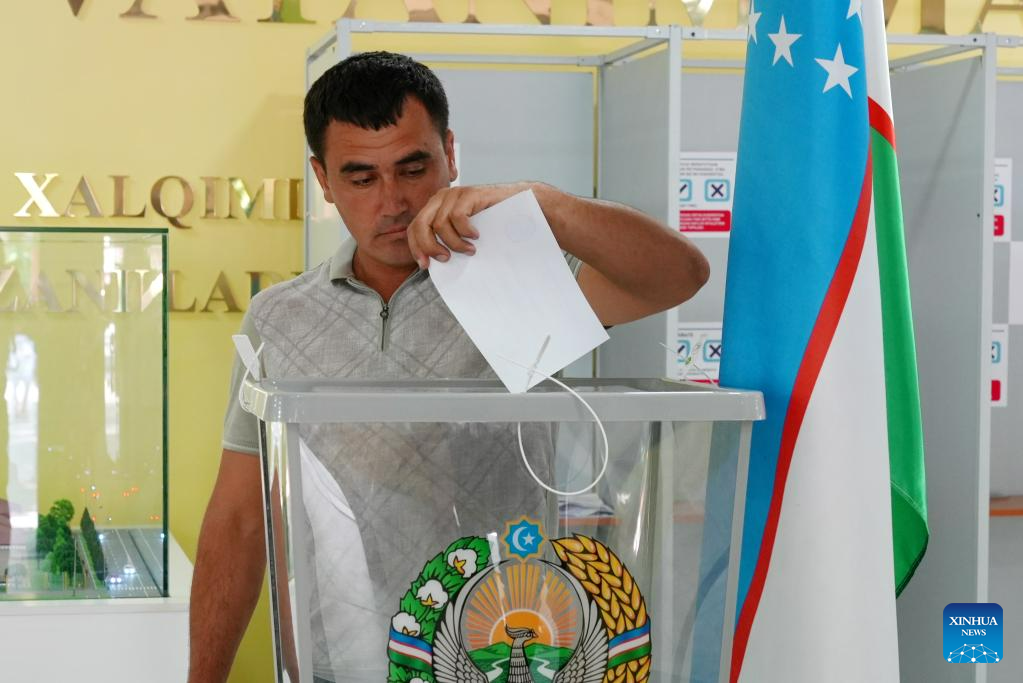 A voter casts his ballot at a polling station during an early presidential election in Tashkent, Uzbekistan, on July 9, 2023. Uzbekistan held the early presidential election on Sunday. (Photo by Zafar Khalilov/Xinhua)
