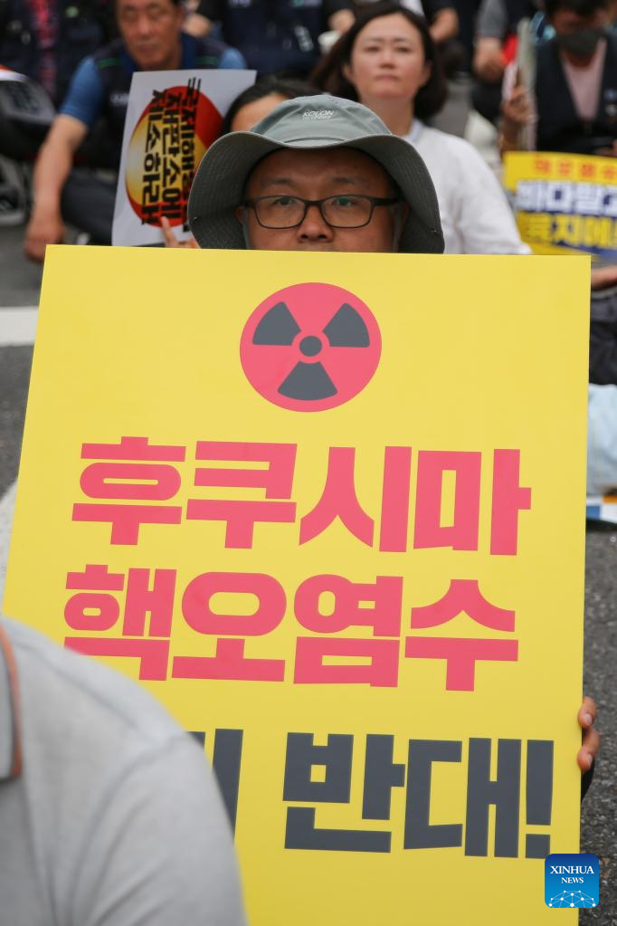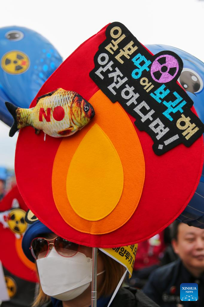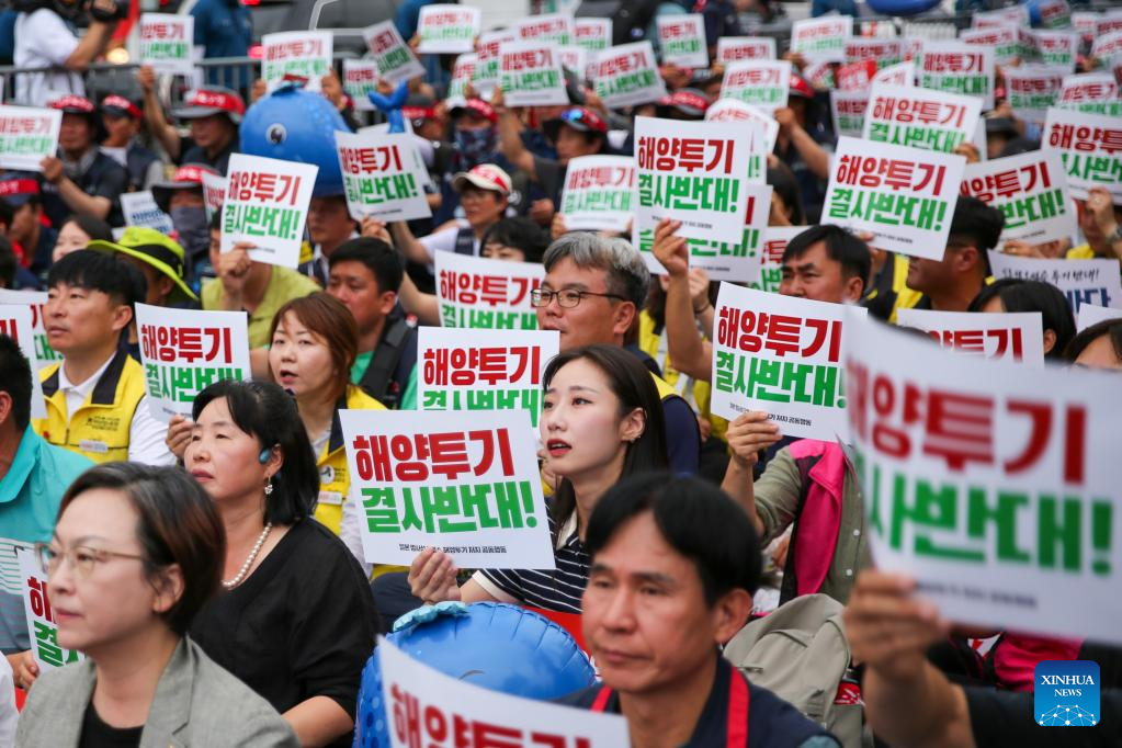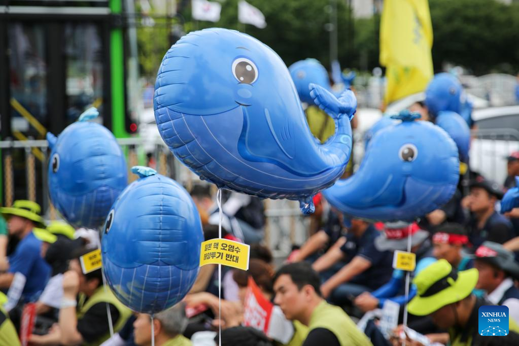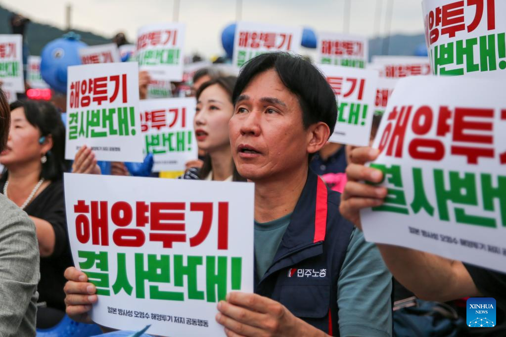 SEOUL, July 8 (Xinhua) -- A group of South Korean civic activists, politicians, fishermen and ordinary people gathered in central Seoul on Saturday to raise their voice against the International Atomic Energy Agency's (IAEA) final report on Japan's planned discharge of nuclear wastewater into the Pacific.