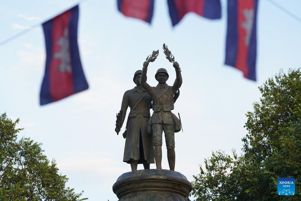This photo taken on July 13, 2023 shows the statues of a Cambodian soldier and a French soldier at a memorial for the dead of World War I in Phnom Penh, Cambodia. Cambodian Prime Minister Samdech Techo Hun Sen on July 14 inaugurated a memorial for the dead of World War I between 1914 and 1918.(Photo by Ly Lay/Xinhua)