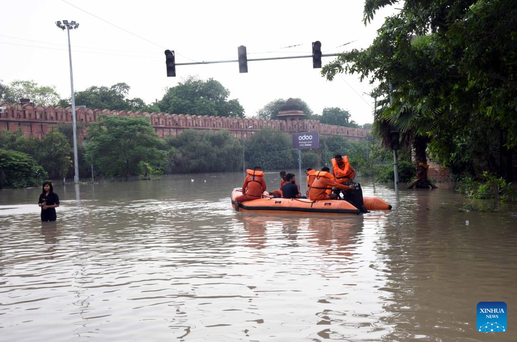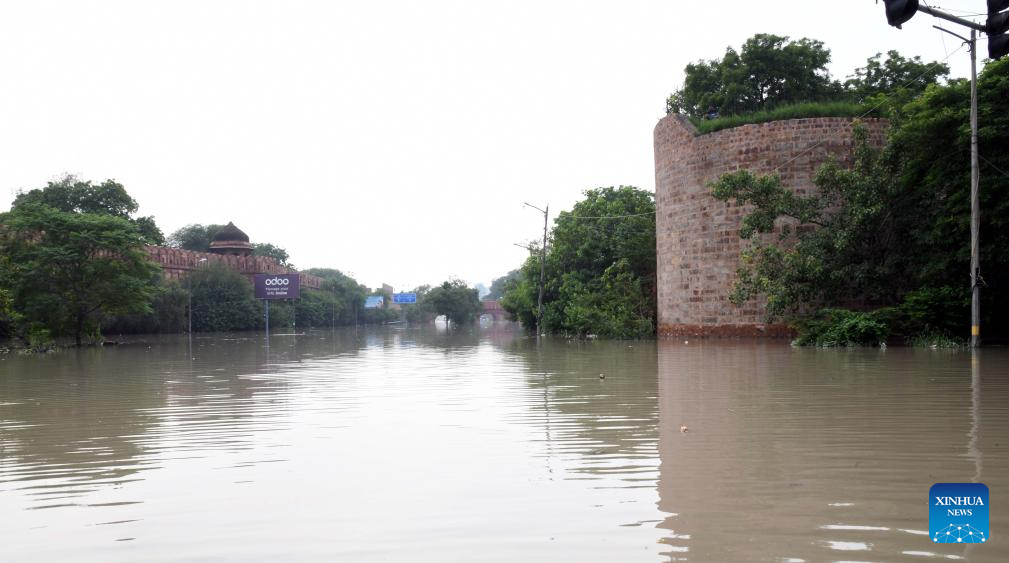 This photo taken on July 14, 2023 shows a waterlogged road beside the historic Red Fort in Delhi, India. (Str/Xinhua)