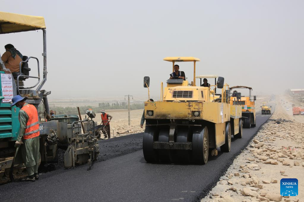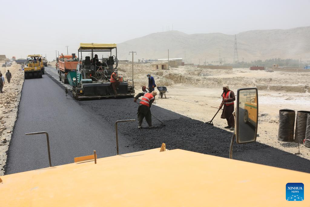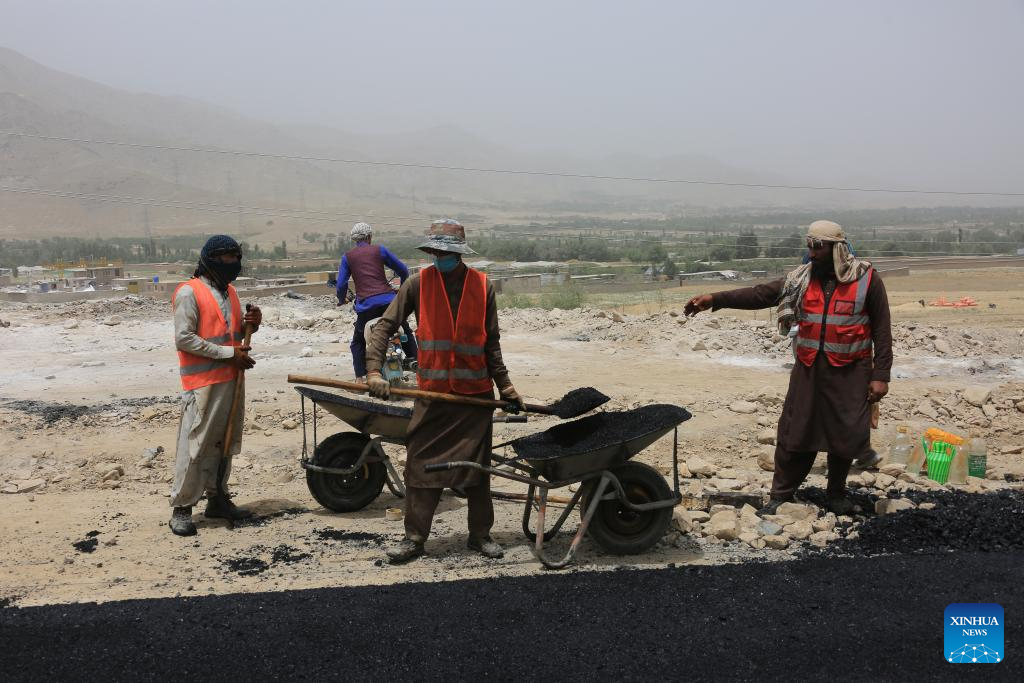 Workers are seen at the asphalting site of a highway linking Kabul and Kandahar, Afghanistan, July 16, 2023. Afghan authorities started the project of asphalting a major section of the Kabul-Kandahar highway on Saturday, according to a statement from the caretaker government. (Photo by Saifurahman Safi/Xinhua)