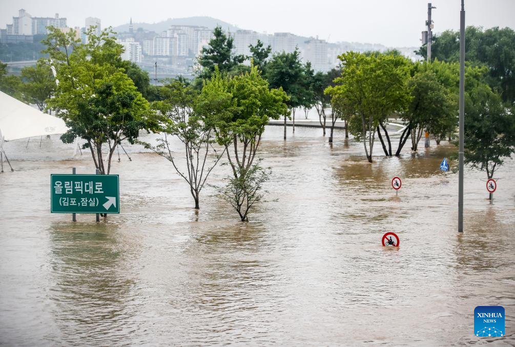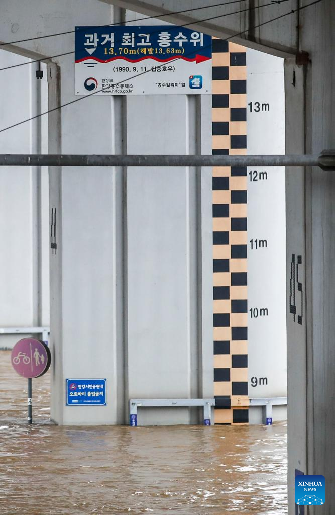 This photo taken on July 16, 2023 shows the flooded Banpo Hangang Park in Seoul, South Korea. The Death toll from the torrential rains over the past week in South Korea rose to 33, while 10 others were missing, relevant authorities said on Sunday. According to the central disaster and safety countermeasure headquarters, 33 people had been found dead in southeastern North Gyeongsang province and central Chungcheong province. (NEWSIS via Xinhua)