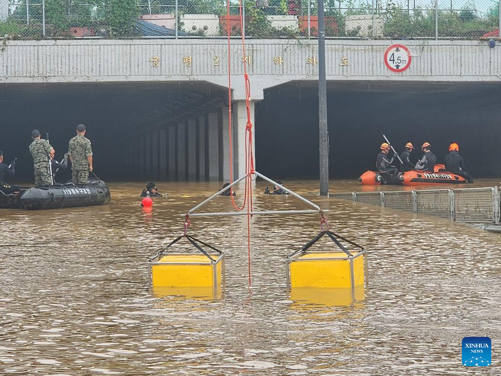 Rescuers are in operation at a submerged garage in Chongju City, North Chungchong Province, South Korea, on July 16, 2023. The Death toll from the torrential rains over the past week in South Korea rose to 33, while 10 others were missing, relevant authorities said on Sunday. According to the central disaster and safety countermeasure headquarters, 33 people had been found dead in southeastern North Gyeongsang province and central Chungcheong province. (NEWSIS via Xinhua)