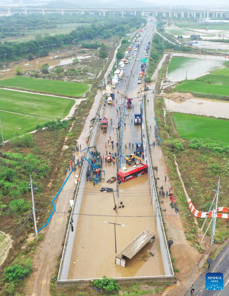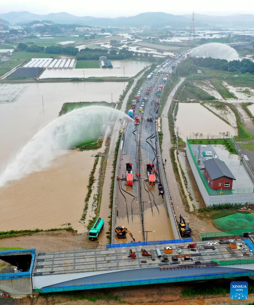 Rescuers are in operation in Chongju City, North Chungchong Province, South Korea, on July 16, 2023. The Death toll from the torrential rains over the past week in South Korea rose to 33, while 10 others were missing, relevant authorities said on Sunday. According to the central disaster and safety countermeasure headquarters, 33 people had been found dead in southeastern North Gyeongsang province and central Chungcheong province. (NEWSIS via Xinhua)