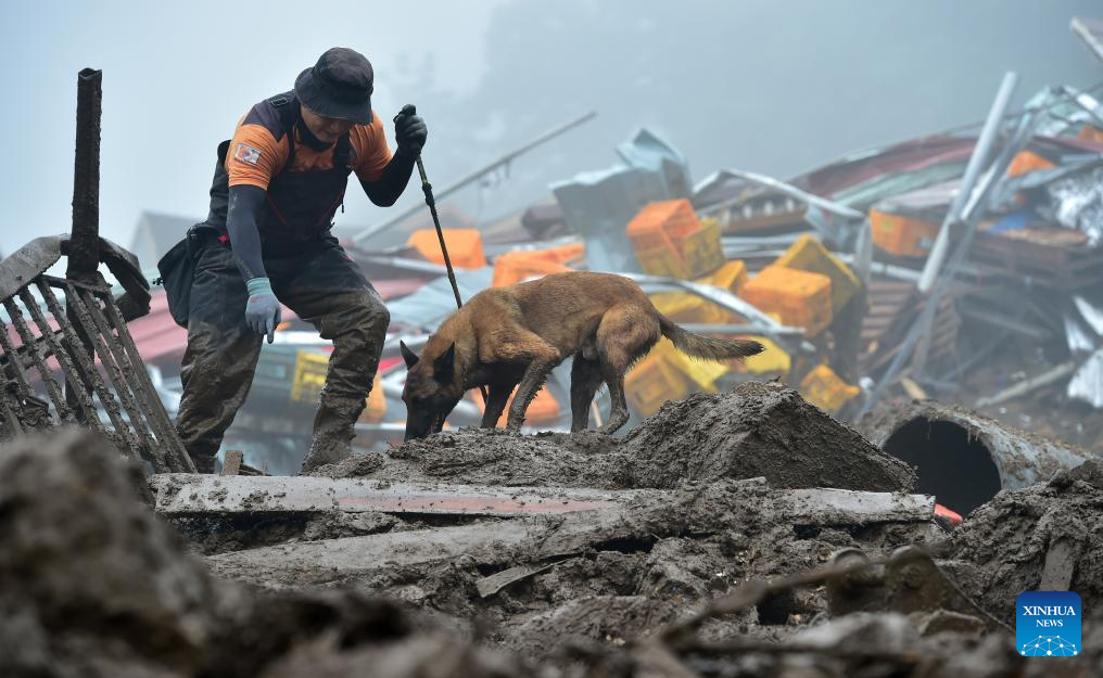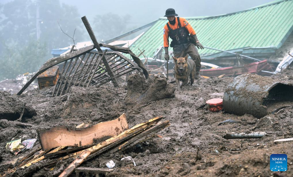 A rescuer and a sniffer dog are in operation at a site of landslide in the county of Yecheon, North Gyeongsang Province, South Korea, on July 16, 2023. The Death toll from the torrential rains over the past week in South Korea rose to 33, while 10 others were missing, relevant authorities said on Sunday. According to the central disaster and safety countermeasure headquarters, 33 people had been found dead in southeastern North Gyeongsang province and central Chungcheong province. (NEWSIS via Xinhua)