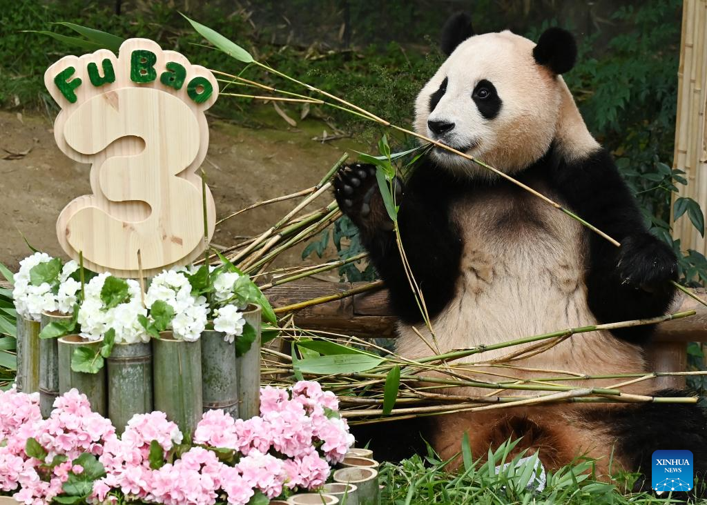 Giant panda Fu Bao eats bamboo at Everland Resort in Yongin, South Korea, July 20, 2023. The giant panda Fu Bao celebrated its 3rd birthday on Thursday. (NEWSIS via Xinhua)