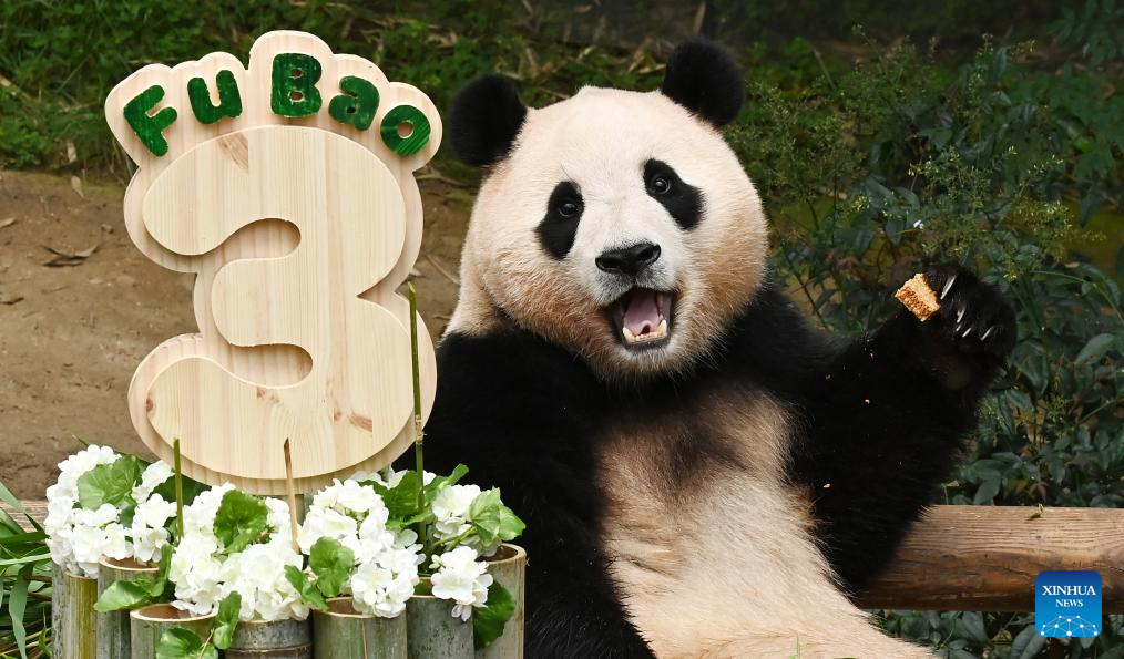 Giant panda Fu Bao eats a cake at Everland Resort in Yongin, South Korea, July 20, 2023. The giant panda Fu Bao celebrated its 3rd birthday on Thursday. (NEWSIS via Xinhua)