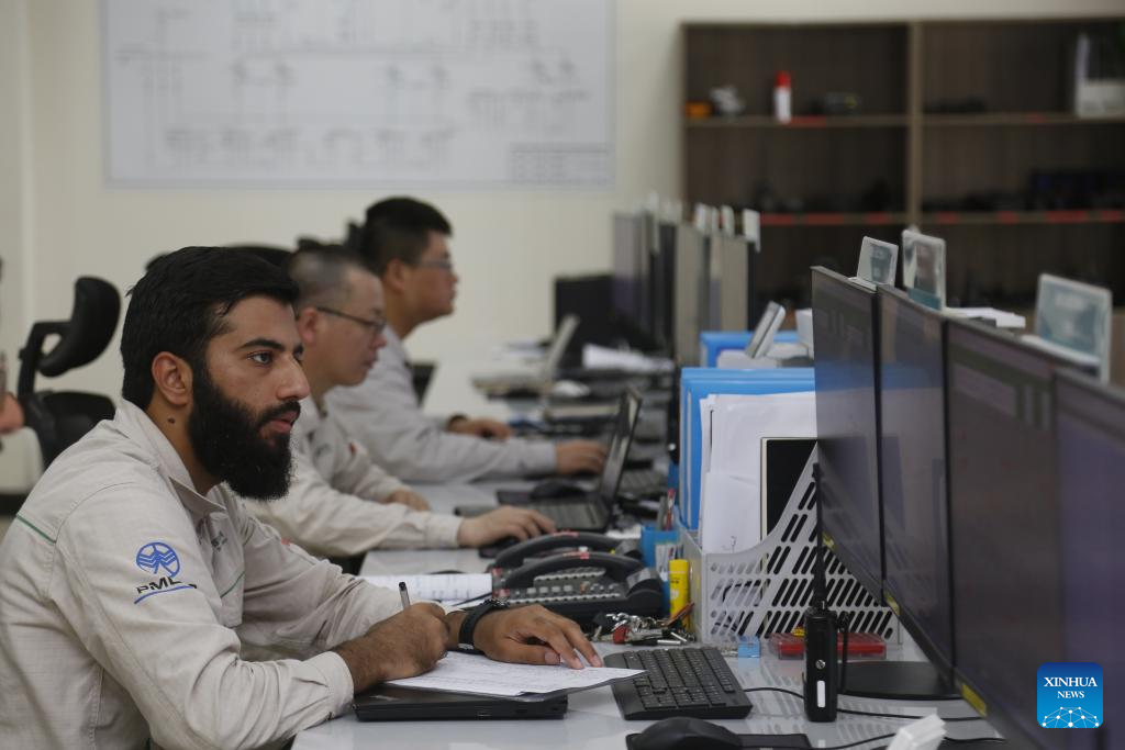 Zubair Tufail (R) works in the control room at a converter station of ±660 kilovolt Matiari-Lahore high-voltage direct current (HVDC) transmission project in a suburb of Lahore, Pakistan, July 4, 2023. (Xinhua/Ahmad Kamal)