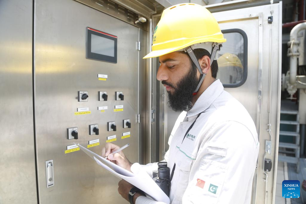 Zubair Tufail checks the operation of equipment at a converter station of ±660 kilovolt Matiari-Lahore high-voltage direct current (HVDC) transmission project in a suburb of Lahore, Pakistan, July 4, 2023. (Xinhua/Ahmad Kamal)