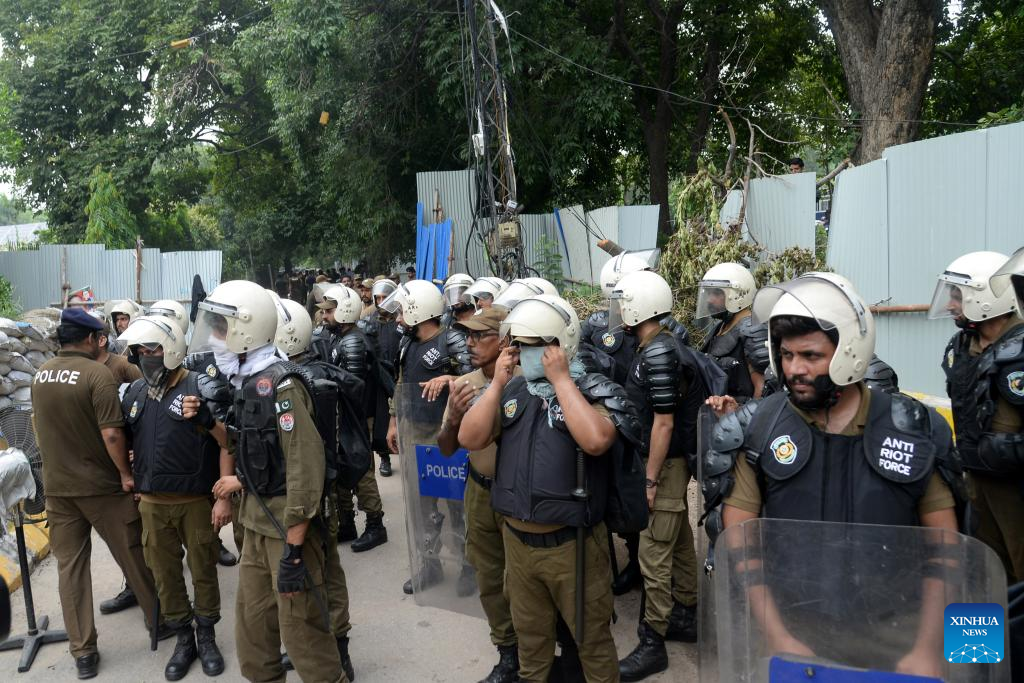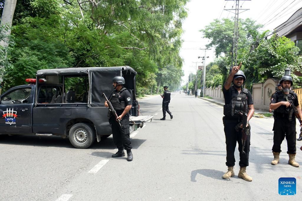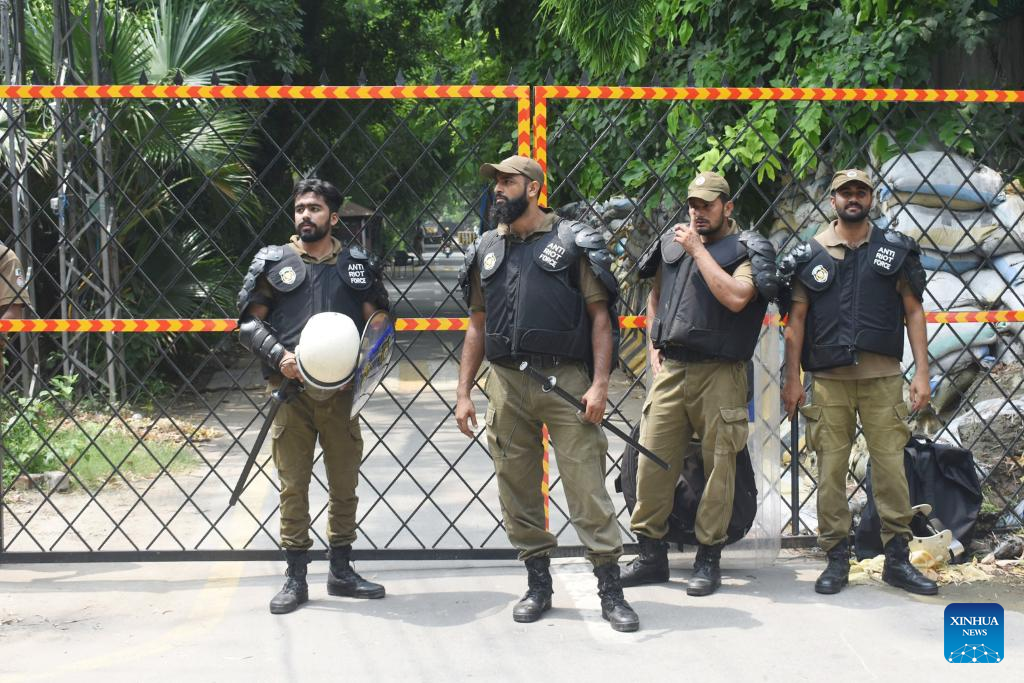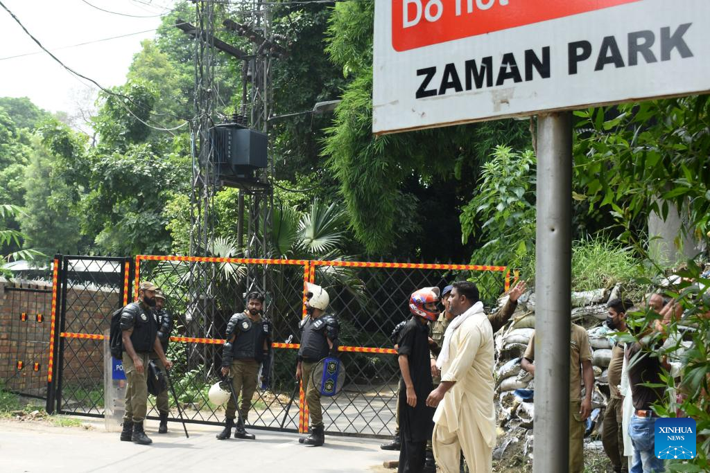 Policemen stand guard near the residence of Pakistan's former prime minister Imran Khan in Lahore, Pakistan, Aug. 5, 2023. The Islamabad police of Pakistan arrested former prime minister Imran Khan on Saturday from his residence in the eastern city of Lahore after a local court sentenced him to three-year imprisonment for hiding his financial assets. The media wing of Khan's party Pakistan Tehreek-e-Insaf (PTI) told Xinhua that the former prime minister was arrested after the court released arrest warrants for Khan. (Photo by Sajjad/Xinhua)